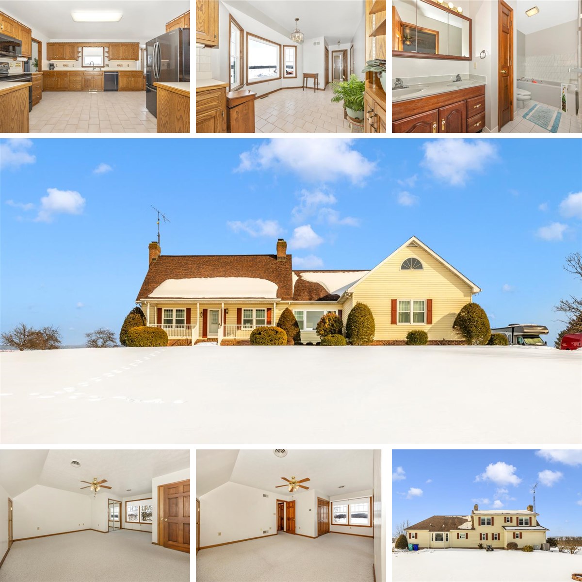 Gorgeous 4-bedroom, 3-bath custom-built home set on 2 scenic acres with wide-open, breathtaking views you simply don’t come across often. Built in 1991 and exceptionally well maintained, this home is truly move-in ready. Major updates include a 50-year architectural shingle roof (2015), windows (2019), appliances (2018), hot water heater (2023), and a new well pump. All systems have been serviced regularly, with all work completed by licensed contractors. The main level features a first-floor owner’s suite with whirlpool tub and separate shower, a second bedroom, tiled kitchen, extra-wide oak staircase, and a brick fireplace with wood holder (cleaned in 2018, never used, capped and sealed). Upstairs offers two large bedrooms, a full bath, and a huge attic with potential to finish into a bonus room. The oversized garage is equipped with central vacuum, heat, A/C, and 230V power. HVAC includes oil backup on the main level and electric backup upstairs. A large unfinished basement with full bath rough-in provides excellent storage and future living space potential. Outdoors, enjoy your own mini orchard with two apple trees, an apricot tree, and a peach tree — all set against expansive views that make this property truly special.
