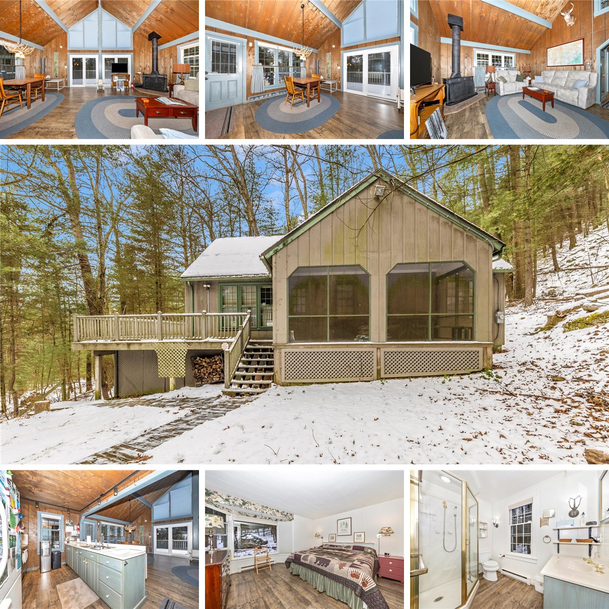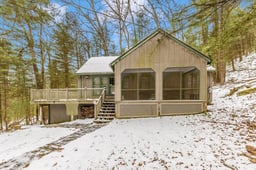 Cabin tucked away in the Michaux State Forest, offering a peaceful, private setting surrounded by nature. The great room features a Franklin wood stove, cathedral ceiling, laminated wood flooring, and versatile window shades that open from both the top down and bottom up to bring in natural light while maintaining privacy. The kitchen area includes a fold-down bar, range, refrigerator, and microwave. Two bedrooms and a full bath are located on the first floor, with an additional upstairs bedroom that can comfortably sleep four. All bedrooms, the great room, and kitchen are equipped with electric baseboard heat and A/C window units. Relax on the sun porch and enjoy the quiet wooded surroundings—an ideal spot to unwind with your morning coffee and take in the sights and sounds of the forest.