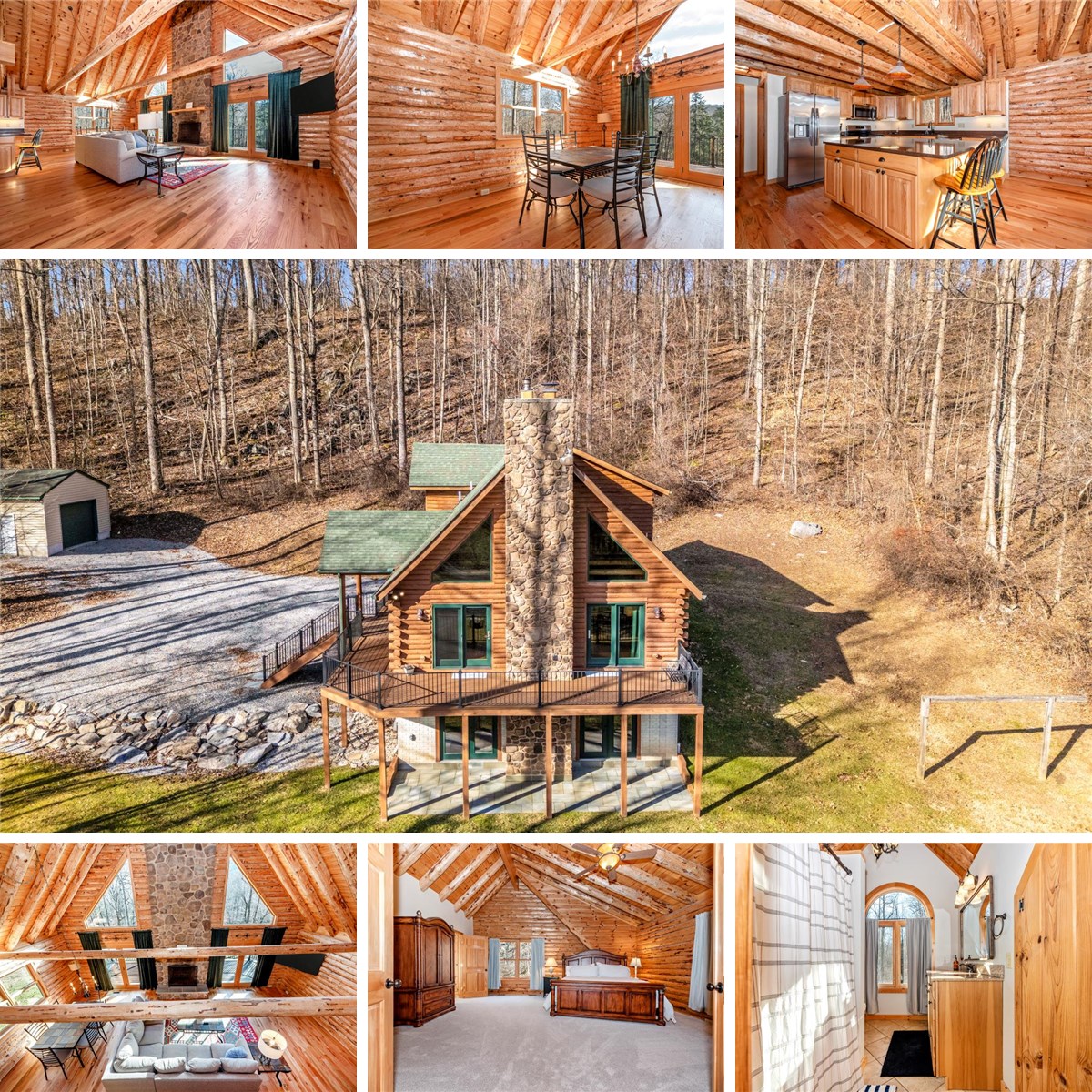 Tucked away on 7 private acres, this immaculately maintained 4-bedroom, 3-bath full solid log cabin offers the perfect blend of rustic charm, modern comfort, and total seclusion. Partially wooded and surrounded by nature, the property boasts peaceful mountain views with no neighboring homes in sight, creating a true retreat in the woods. Crafted as a true log home—not log-sided—this residence features timeless log construction, a spacious wraparound deck, and a 9-person hot tub ideal for relaxing and entertaining year-round. Inside, the layout is both functional and inviting: the upper level hosts a private primary suite with an attached full bath, the main level includes two bedrooms and a full bath, and the lower level offers an additional bedroom, full bath, and a large flex room perfect for a game room, bonus living room, or guest space. High-speed internet ensures you can stay connected while enjoying the serenity of mountain living. This home was manufactured by Lok-N-Logs, who warranty all logs for life. Recent improvements include a flagstone patio (2023), Trex decking (2023), water heater and well bladder pressure pump (2023), new heat pump and air handler (2024), and refinished hardwood floors (2024). Don't let this gem get away!