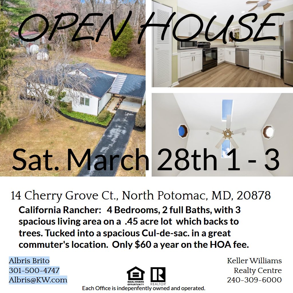 This well-maintained California ranch-style single-family home in North Potomac is located on a quiet cul-de-sac on a premium . 45-acre lot. Conveniently located in the Quince Orchard Knolls subdivision, this turnkey home is ready for its new owners. This light-infused home offers 4 bedrooms and 2 full bathrooms. Updates are evident throughout the property, including new carpeting, tile, and fresh paint. As you enter the foyer, you will feel welcomed by the warmth of this home, opening to the central family room, with a cathedral ceiling, skylight windows, brilliant light, and further openings to the living room and dining room. The dining room, with an oversized French door opens to a large, covered deck, which further allows light to fill the space and provides access to the large rear and side yard. The kitchen boasts new cabinets, countertops, sink, flooring, refrigerator, lighting and paint. The primary bedroom has a walk-in closet and private access to full bath, also with hall access. The infrastructure and mechanics of this home have been well maintained and updated. The entire crawl space has undergone a full re-encapsulation, as well as new insulation. A new hot water heater was installed in 2022, and the furnace and HVAC were replaced in 2013. The home entrance and carport include a walkway portico allowing for ease when entering the home in all weather. There are 2 storage areas attached to the main home and an oversized storage shed in the rear yard. The spacious semi-private backyard and covered deck is great for gardening and or entertaining. Just minutes to the Kentland's, and convenient to Rio and Crown, with easy access to 270 and major commuting routes, great schools, shopping, restaurants, and several local parks. Youl fall in love with this home.