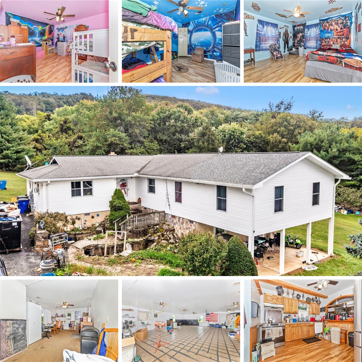 Beautiful 8-Bedroom Home on 5 Acres with Endless Possibilities! Discover this well-maintained 8-bedroom home situated on 5 picturesque acres, offering versatile living arrangements and incredible potential. The main level features 6 spacious bedrooms, 2 full bathrooms, an open-concept kitchen, dining area, and a cozy living room with a wood stove and charming brick accent wall. The lower level is a fully equipped in-law suite, complete with its own kitchen, living room, dining area, 2 bedrooms, and a bright sunroom with a private entrance — perfect for extended family, rental income, or Airbnb opportunities to help offset your mortgage. A large two-car oversized garage includes a finished upper level that’s ready to be transformed into an additional apartment — just add a bathroom and kitchen, and you’ll have even more income potential or guest space. Outdoors, the property is designed for fun, relaxation, and adventure. Enjoy a 900-foot wooden adventure trail that winds through the trees, a playground, and a flat open space ideal for camping, gatherings, or even possible subdivision (buyer to verify). With room for two families, outdoor entertainment areas, and future expansion options, this one-of-a-kind property offers a rare combination of comfort, income potential, and natural beauty.
