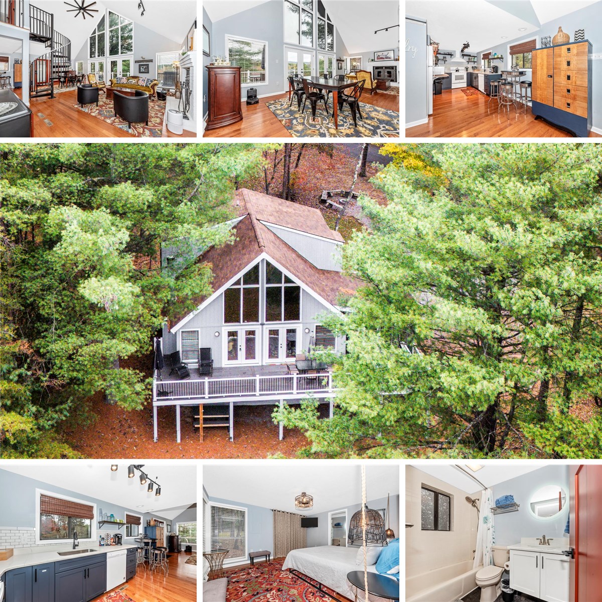 Beautiful Modern Chalet with Scenic Golf Course & Lakeside Views! This stunning 3 bedroom, 3 bath home offers a bright and open design with one bedroom conveniently located on the main level. A spiral staircase leads to the upper level, while large windows bring the outdoors in, with two bedrooms on the upper level. Every bedroom features a private en suite bath with sleek, spa style finishes. The updated kitchen boasts new cabinetry, white quartz countertops, and an electric oven. Breathtaking views from every angle, golf course, wooded setting, and serene lakeside scenery. Step outside to a spacious deck with a brand-new hot tub, perfect for relaxing or entertaining. Laundry on the main level. Furnishings and contents are available.