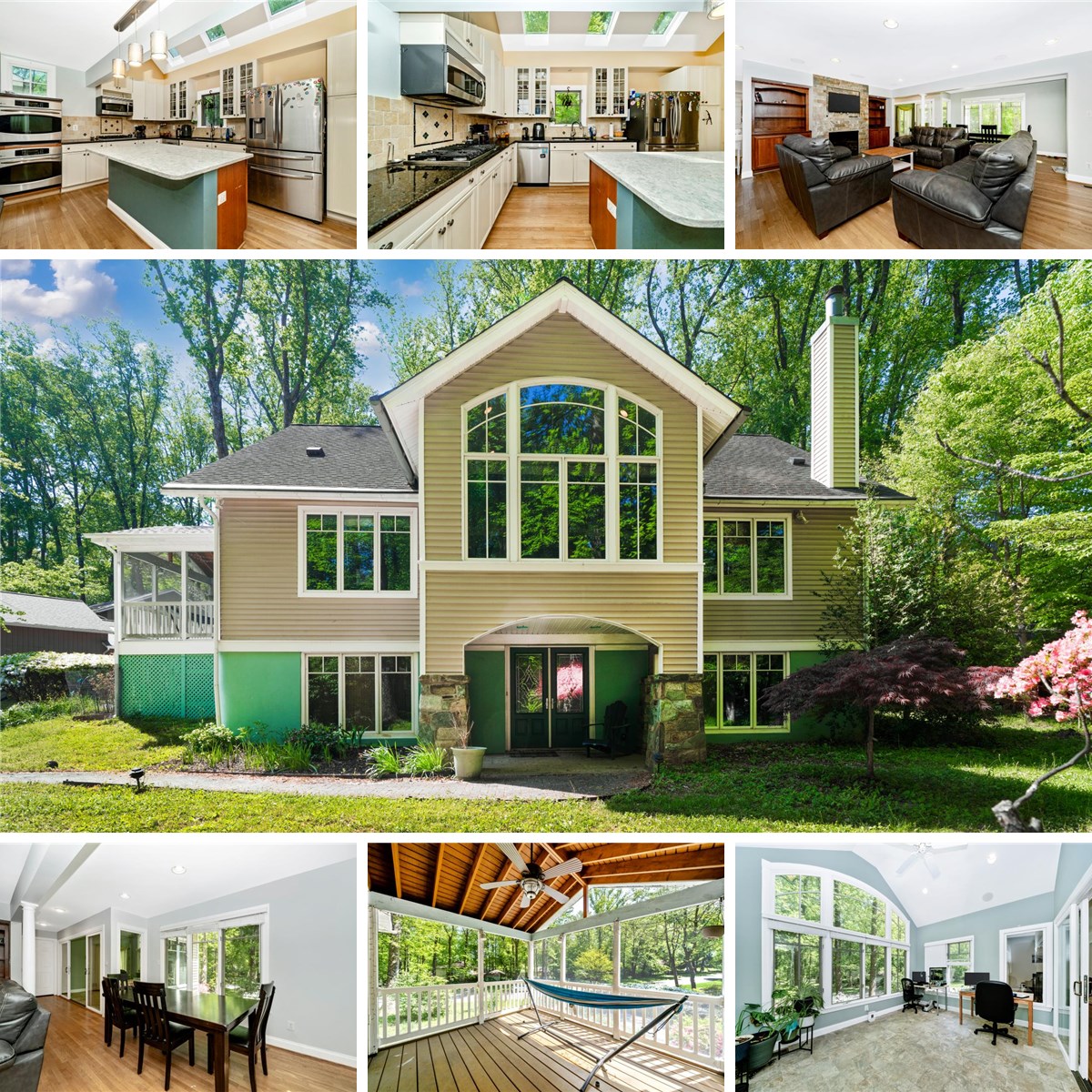 Striking contemporary home on a beautifully wooded lot offering exceptional privacy and architectural character. This 5-bedroom, 3.5-bath residence features dramatic vaulted ceilings, skylights, and a bright, open layout designed for both comfortable living and flexible use. The main level includes expansive living and entertaining spaces: great room with fireplace, sunroom with heated floors, screened porch, dining area, and a chef’s kitchen with white cabinetry, granite countertops, center island with breakfast bar, double oven, and built-in microwave. The main-level owner’s suite provides a private retreat with a walk-in closet with organizers and a spa-style bath with dual vanities, large shower, and oversized jetted tub surrounded by windows. A unique street-side entrance creates an ideal setup for a home office, studio, or client-facing professional space. Heated floors extend through the office, waiting room, sunroom, and primary bath. Surround-sound speakers are installed in the front room, patio, sunroom, and primary bedroom. The upper and lower levels offer four additional bedrooms, perfect for guests, offices, or multi-purpose living. The walk-out lower level includes a finished recreation room with wet bar and access to the rear yard. Outdoor features include raised garden beds, fire pit, patio fountain, and a charming chicken coop (hens negotiable). Seasonal plantings add color throughout the year. Prime location within walking distance to Potomac Village and directly on the bike path to Great Falls Park. Situated in a top-rated school district and offering a rare combination of lifestyle, convenience, and versatility.